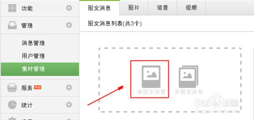 同樣先點擊 =》【素材管理】=》選擇【單圖文編輯】